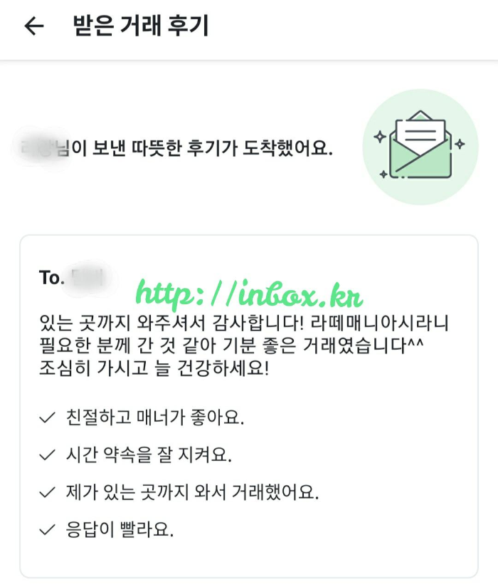 집에 오다보니 알람이 울린다. 어? 거래후기라는게 있네? 감사하게스리. 좋은 말을 해주었네. 나도 감사하다는 말 한번 더 하고.