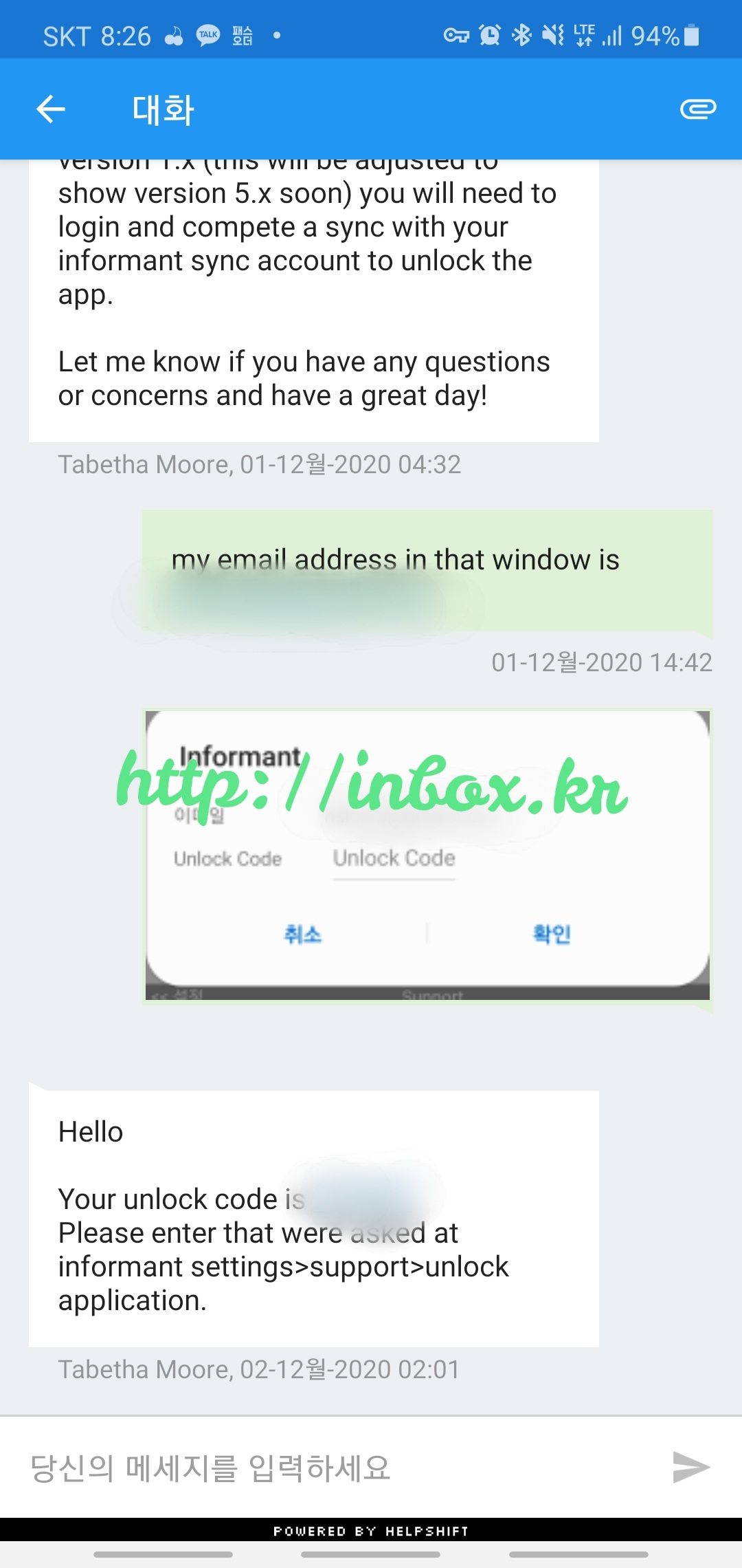 (이메일은 블러처리) 언락코드 넣는 곳이 있었다. 이넘들 말이 맞네. 지원은 해 주려나보다.