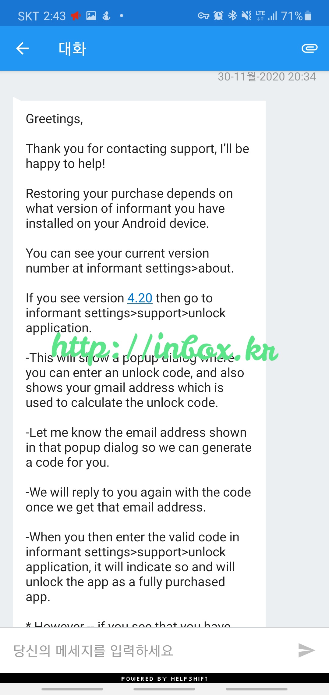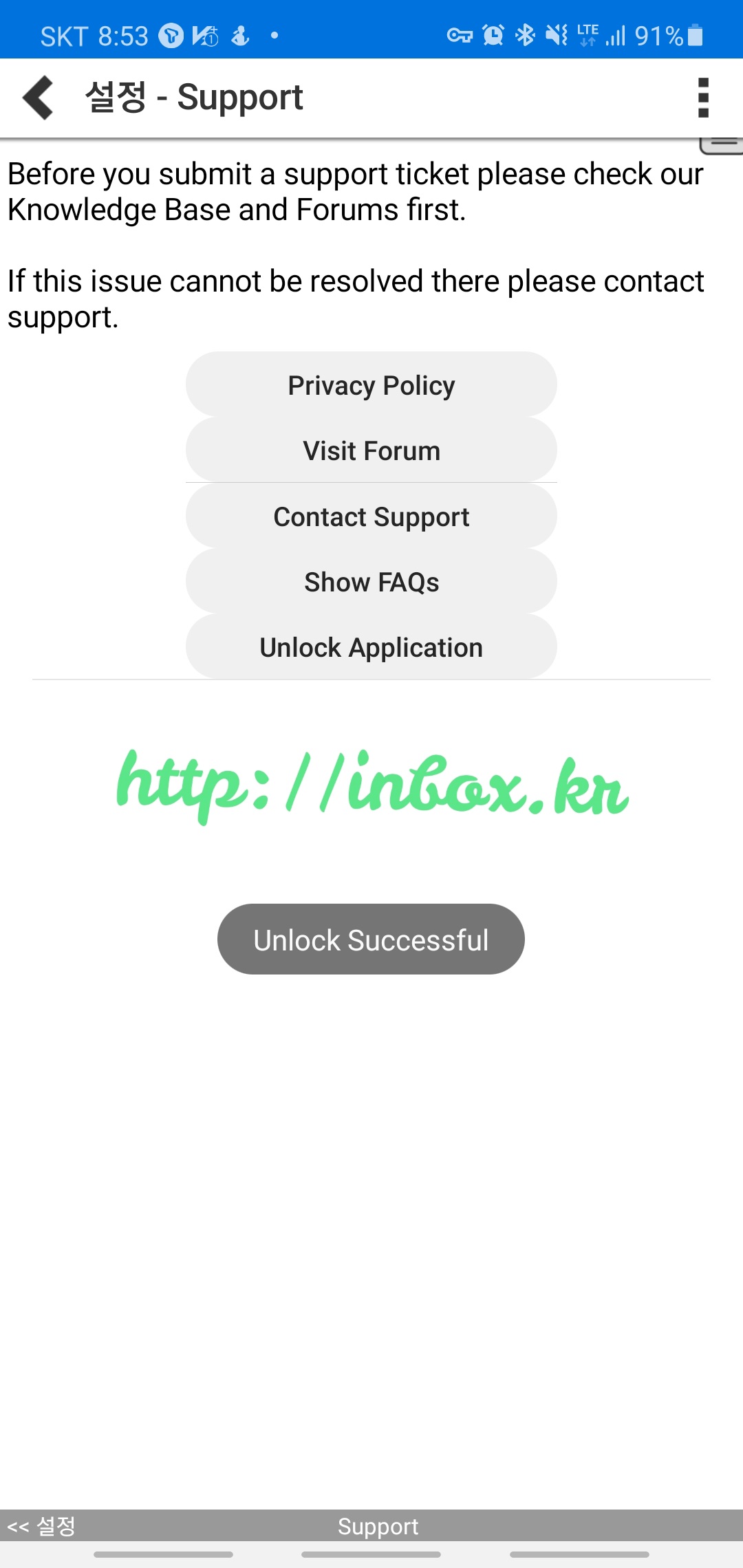 요약하면 설정>지원>unlock application 메뉴에 가서 언락하라는 얘기다. 거기 나온 이메일을 보내달라네.