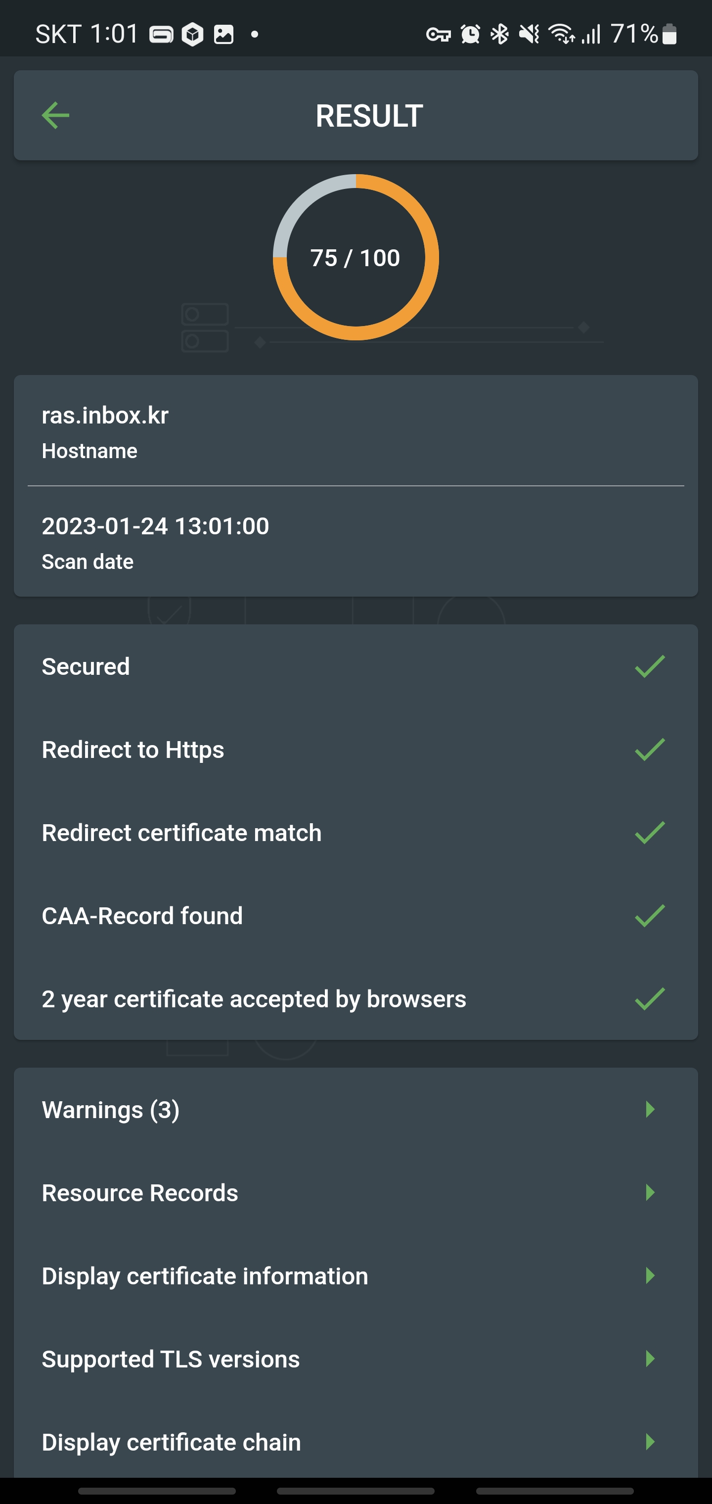 그 레코드를 추가한 후 다시한번 검사를 해봤다. 5점이 올라가기는 했으나… 다른 보안이슈들이 발목을 잡는다.
