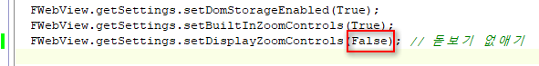 그리고 소스 중 일부 내용을 바꿔준다. -> setDisplayZoomControls(False)로 바꿔준다.