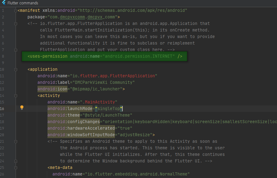 그래서 AndroidManifest.xml 파일에 권한 추가하는 명령어는 넣어줬다.